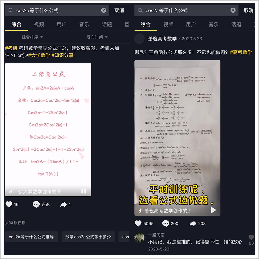 如今,抖音视频搜索已将OCR、ASR技术进行应用,即抖音视频里的文字和语音都能被系统识别。举个例子,当用户在搜索框里输入“Cos2a等于什么公式”,即使文字没有体现,也能在搜索页面中找到包含“Cos2a”的公式视频。