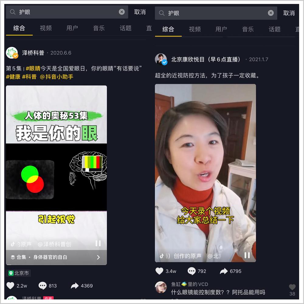 甚至是与搜索词相关的都能识别,比如搜“护眼”,搜索结果画面呈现的视频中全程不提“护眼”二字,却跟“护眼”高度相关,比如预防近视、科普眼睛视觉奥秘。