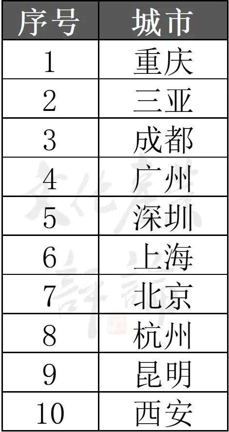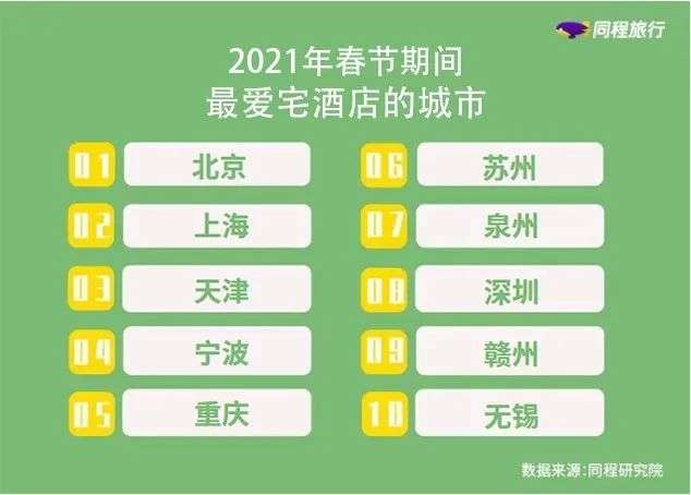 另据同程研究院数据显示,春节假期期间,本地酒店预订占比较高、“最爱宅酒店”的城市主要有:北京、上海、天津、宁波、重庆、苏州、泉州、深圳、赣州、无锡。整体酒店预订热门城市主要集中在一线和新一线核心城市,分别为:重庆、深圳、成都、上海、广州、北京、西安、三亚、苏州、杭州。