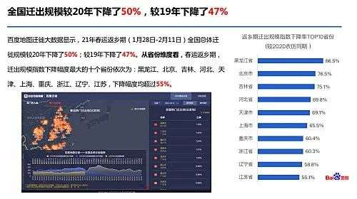 受疫情防控和“就地过年”政策影响,与疫情前浩浩荡荡的返乡客和跨省游相比,不少地区2021年春节黄金周省外游客和省内人口流动将较往年大幅减少。据百度地图迁徙大数据显示,今年春运返乡期全国总体迁徙规模大幅下降,迁徙规模指数较去年下降50%,较2019年下降47%。黑龙江、北京、吉林、河北、天津、上海、重庆、浙江、辽宁、江苏等十个省份降幅排名前十,均超过55%。