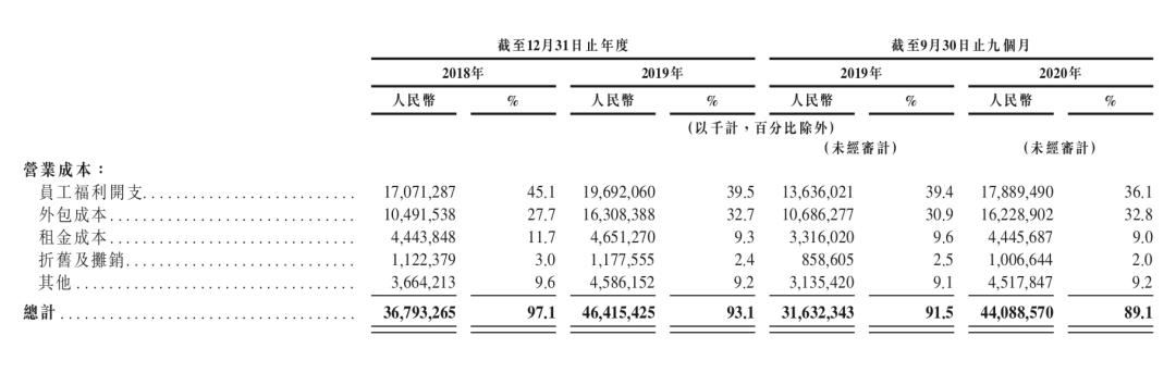 在京东物流的经营成本中,人力成本始终是大头,2020年前9个月占比43.1%。其次是占比32.7%的外包人员。
