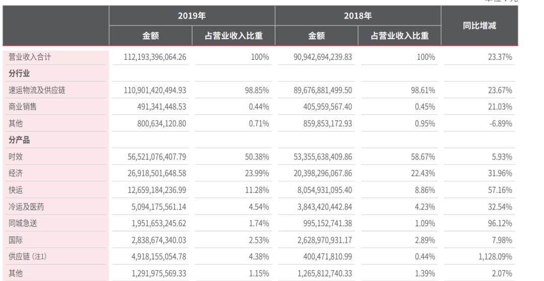 2019年,尽管顺丰的传统业务依旧占大头,供应链收入仅贡献49.18亿元,占总收入4.4%。但在顺丰冷运、同城、国际、供应链和仓储等一众新兴业务中间,它的增长最快,增长率超过1000%。