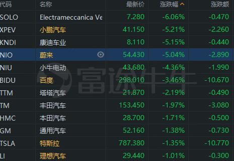 知名中概股中:阿里跌2.33%;百度跌3.46%;京东跌1.36%;网易跌2.03%;新浪涨0.19%;新浪微博跌0.32%;拼多多跌3.47%;蔚来跌5.04%;小鹏汽车跌5.21%;理想汽车跌1.01%;爱奇艺涨2.52%;