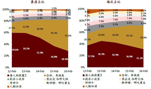 图4:春节档票房和排片场次份额走势对比。资料来源:艺恩,中金公司研究部