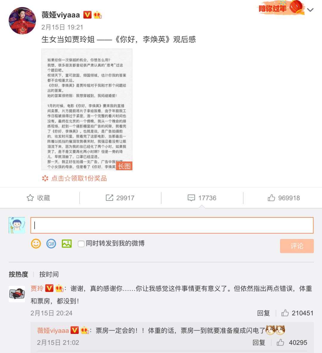 2月15日,“淘宝带货一姐”薇娅发表一则观后感长文,也为这部电影贡献了一个热搜。