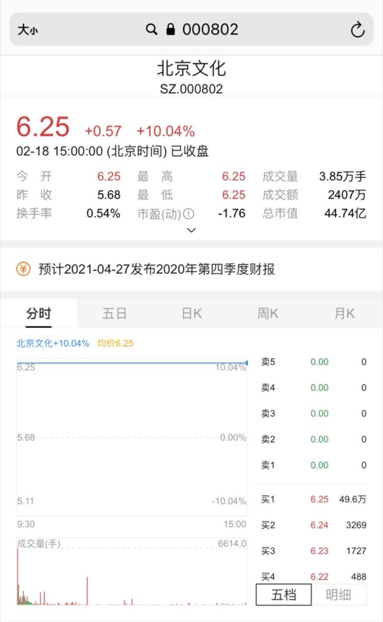 2月18日下午,《你好,李焕英》主出品方北京文化开盘一字涨停,截至收盘,该股报6.25元。
