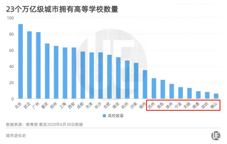 城叔统计了23个“万亿俱乐部”城市所拥有的普通高等学校数量,排名靠后的8座城市都是非省会城市,其数量不及对应省会城市的一半。