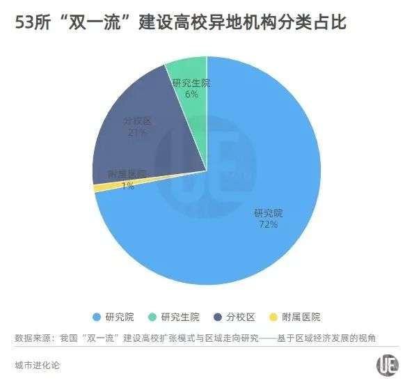 过去20年,这53所“双一流”建设高校在异地共设立了166个机构,《研究》一文将“机构”分为研究院、研究生院、分校区及附属医院4种形式。