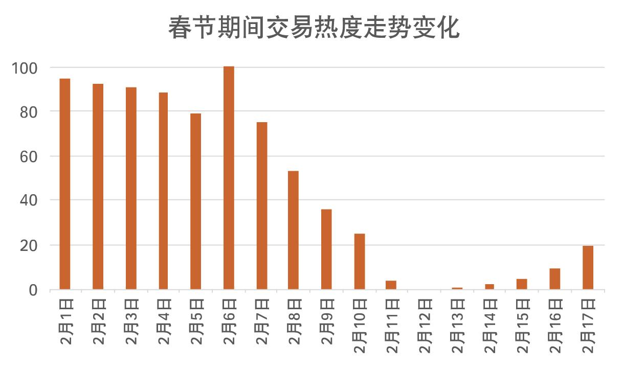 如图所示,春节前后,交易热度呈现比较明显的“V”型走势,交易热度集中在除夕前一周,除夕后交易热度缓慢回升,预计本月回升趋势会持续明显。分城市级别看,这一趋势表现出同样特点。