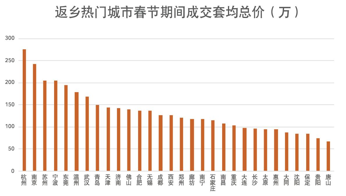 其中,以成都、西安、苏州及天津为代表的新一线城市,春节期间交易热度明显较高;同时,三四线城市成交趋冷,城市间分化现象比较明显。从套均总价看,杭州、南京、苏州及宁波等南方城市均价相对较高,受到城市经济基本面、人口流动等因素影响,“南高北低”显现显著。从结构性数据看,春节期间成交主力户型仍以小户型为主,并没有表现出显出差异性。