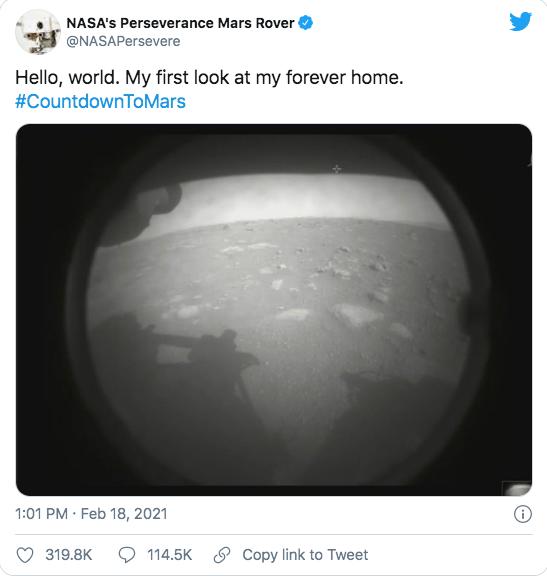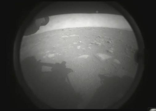 几分钟后,毅力号发回了自己拍下的第一张火星图片。NASA配文:“你好,世界!这是我永久的家,这是我在这里拍的第一张照片。“
