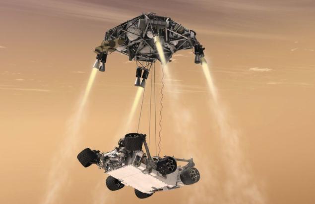 三分钟后,降落伞展开,弹出当热板。之后外壳背面分开,空中吊车下降速度随之迅速下降,同时将毅力号利用尼龙绳放落。