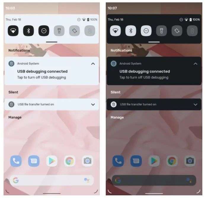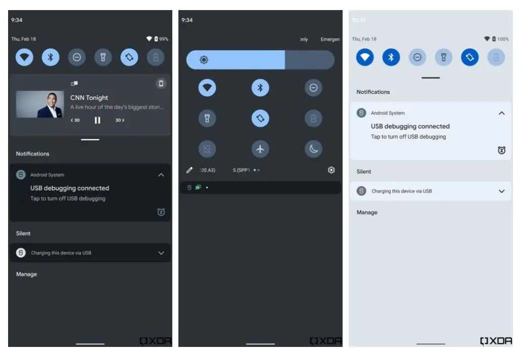 XDA网友还是在系统中发现了隐藏的新界面,看起来颇有泄露图中的感觉,采用大面积的浅色,并且引入了更大的亮度滑动条和快捷按钮。和当前的预览版相比,我们能发现,谷歌更希望用透明来提供高效率的手机使用体验,纯色好看却和现在的主流相背而行。