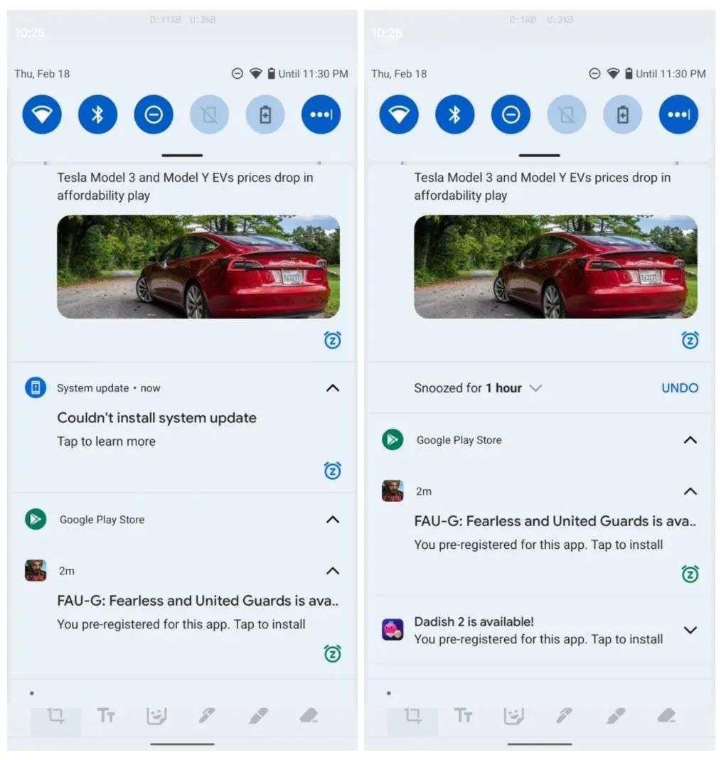 通知暂停功能有了新的入口,它以闹钟图标直接显示在通知上面,点一下就可以让应用安静一会过段时间再通知。新的设计变得更直观却也让应用通知显得有些拥挤,或许这就是谷歌调整布局的理由之一,不过在国内,更多用户会直接选择关闭通知。