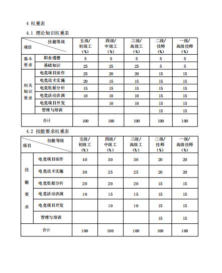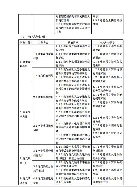对于不同等级技师的技能要求依次递进,高级别涵盖低级别,具体在职业功能、工作能容、技能要求和相关知识要求方面等方面有所区分。此外,具体的工作要求和权重表等方面的内容显示,电子竞技员并不是无门槛的行业,评级需要理论考试和专业能力考核,而对于二级/技师、一级/高级技师还须进行综台评审。