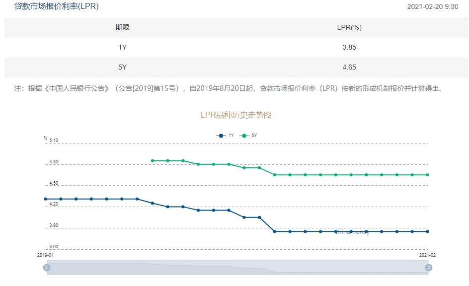 中国人民银行授权全国银行间同业拆借中心公布,2021年2月20日贷款市场报价利率(LPR)为:1年期LPR为3.85%,5年期以上LPR为4.65%。