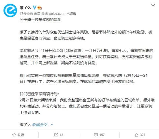 后来饿了么在官微发布声明称,确实在一些城市和商圈的单量预估出现偏差,导致第6期在进行中,这些区域目标偏高,真诚向骑手致歉。