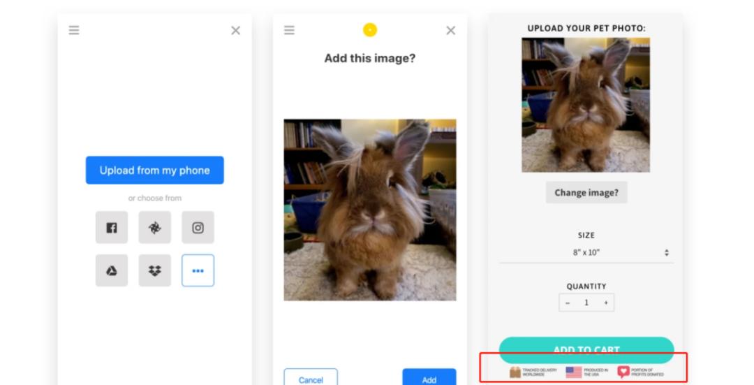 销售渠道拥挤的情况下,转化率就是变现的关键变量。美国一个 2019 成立、但增长快速的宠物肖像定制品牌 Crown&Paw 在购物车底部加上全球物流全程追踪、美国制造和慈善捐助的标签,据该品牌分享,这三个按键对增加消费者的信任非常重要,是转化的重要一步。