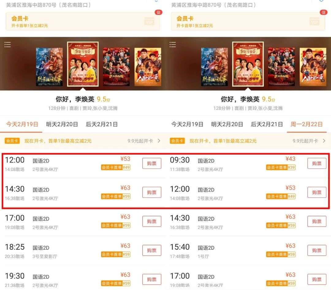 复工当天,记者对淘票票上的电影院票价进行了比对。以《你好,李焕英》为例,2月19日大地影院(华润万家大华店)的电影票价还是70元起,而20日同场次的票价已经下降至56元起;21日的票的价格降低至55元起。再看《刺杀小说家》,2月20日至22日期间,该片在曹杨影城的票价也从20日当天全时间段52元下降至49元、44元。