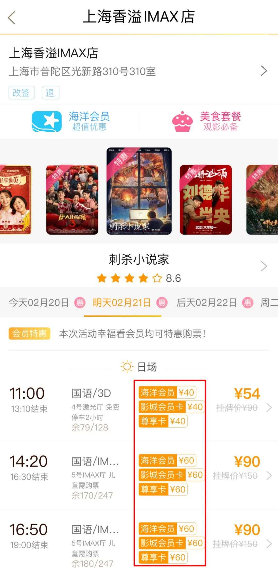 以幸福蓝海国际影城上海香溢IMAX店为例,在淘票票上购买2月21日11点的《刺杀小说家》电影票需要49.5元。如果花费9.9元购买影城卡,再购票可以减免2元。