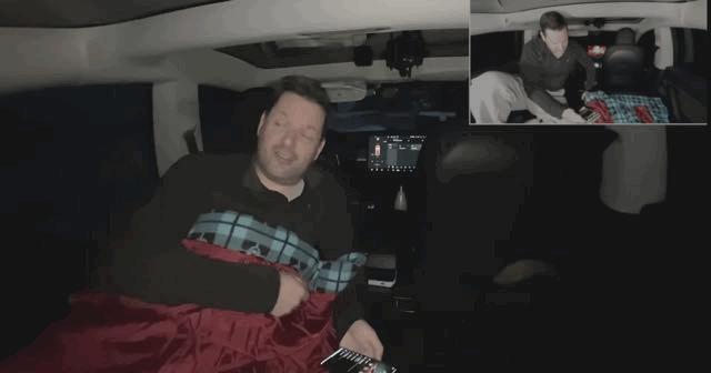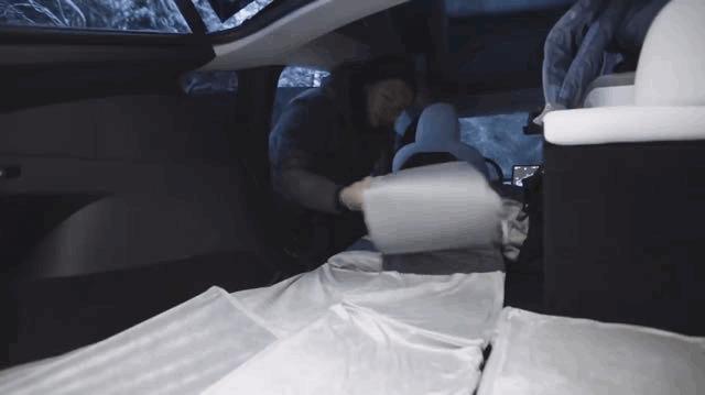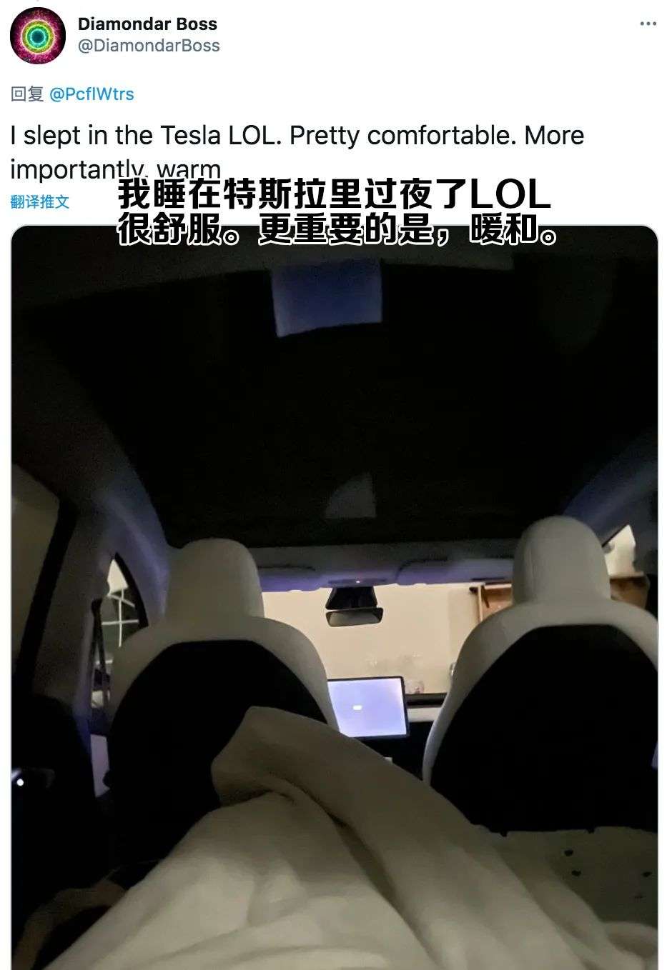 他晒出了自己将特斯拉后座改造成睡床的照片:“我睡在特斯拉里过夜了,LOL(大笑)。很舒服。更重要的是,暖和。”