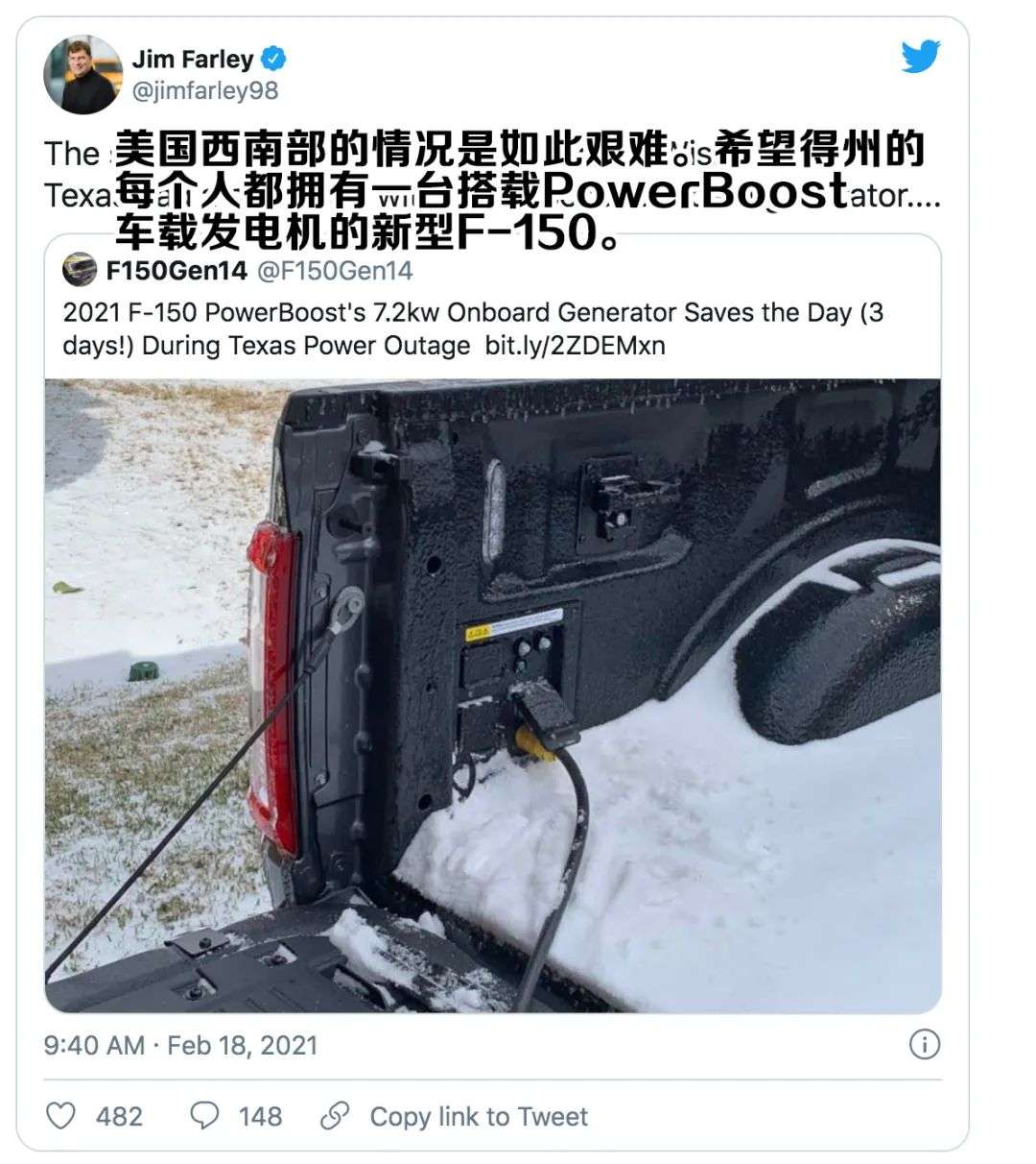 福特首席执行官吉姆·法利在推特上写道:“美国西南部的情况是如此艰难。希望得州的每个人都拥有一台搭载PowerBoost车载发电机的新型F-150。”