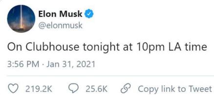 [2] 《这个被马斯克带火的APP,国内至少10个创业团队在复刻》,“吴晓波频道”微信公众号,2021年2月9日。