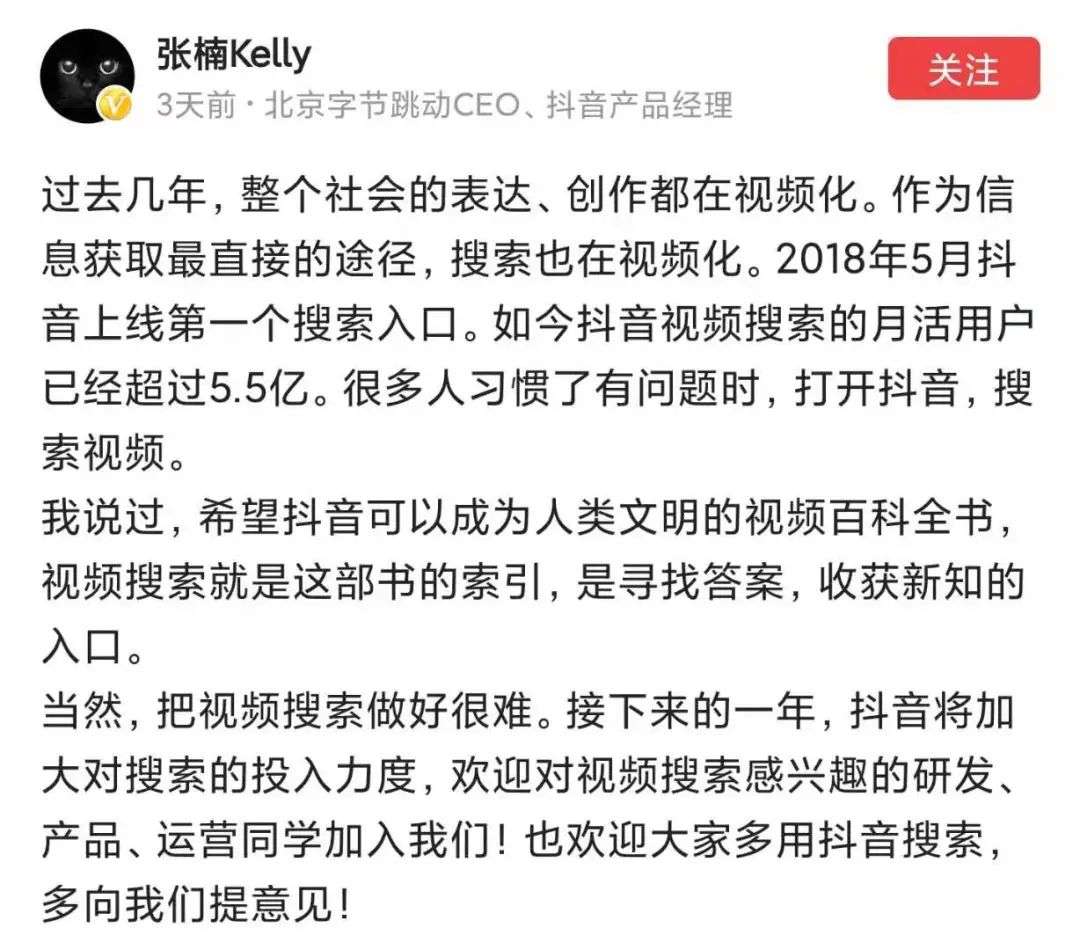 视频搜索之于抖音的意义也不言而喻——在这个日活超6亿的国民级应用中,搜索功能月活已达5.5亿。正如字节跳动CEO、抖音产品经理在近日发布的微头条,“很多人习惯了有问题时,打开抖音,搜索问题”,搜索已经是短视频用户日常使用中,相当重要的一项功能。