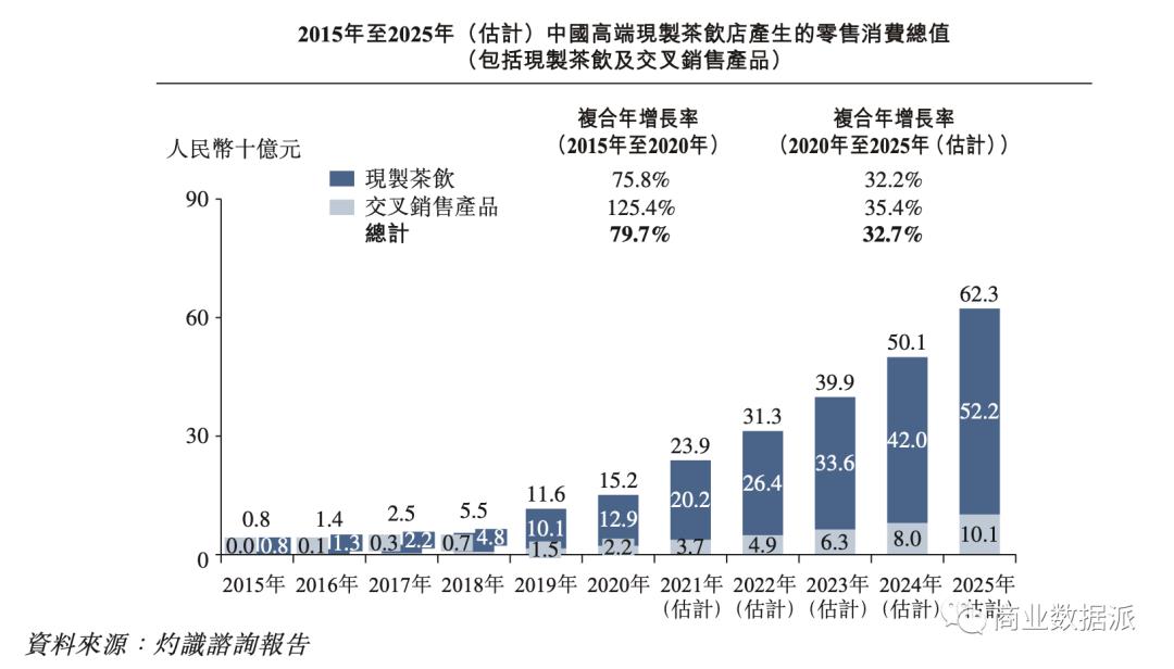 中国现制茶饮的市场规模依然在不断高速成长,在经历了2015年至2020年的高速成长期之后,预计未来五年内的复合年增长率在32.2%,市场空间从2020年的152亿元增长至2025年的623亿元。
