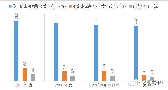 截止2018年及2019年12月31日止年度,租金和水电累计成本占同期收益比重为8.9%和7.1%,2020年前三季度,租金、水电开支为11460万元,占同期收益比重为5.4%,比重还在降低。