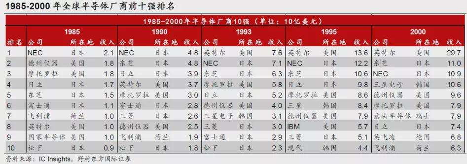 1995年,世界半导体企业前十中,NEC(第一)、东芝(第二)、日立制作所(第三)、富士通(第八)、三菱电机(第九),这一年也成为了日本半导体产业最后的余晖,日本最终失去了这场战争。