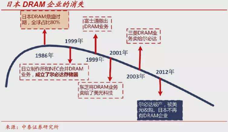 1999年,NEC和日立分别剥离旗下DRAM业务,成立了新公司尔必达(Elpida),2004年三菱电机的DRAM业务部门也被并入,自此,在1995年的全球十大半导体厂商排名中分别位列第二、第四和第九的三家日本半导体厂商的DRAM业务合并为新的公司尔必达。