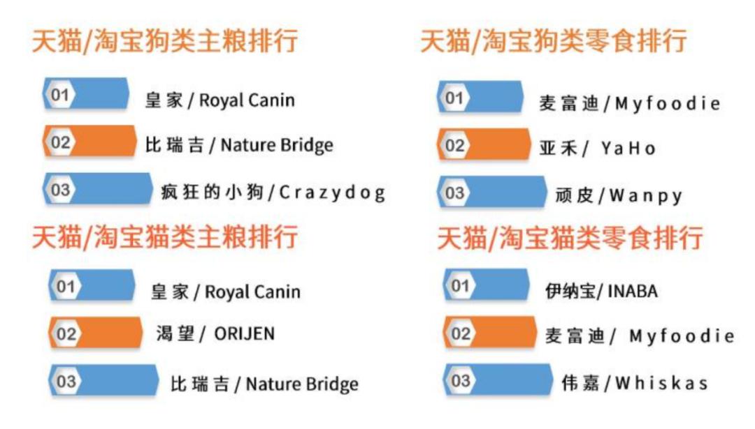 根据“艾媒咨询”数据,天猫和淘宝渠道中,皇家、比瑞吉、疯狂的小狗、麦富迪、顽皮、亚禾、渴望、伊纳宝、伟嘉等品牌处于前列,其中不少都是国产品牌。