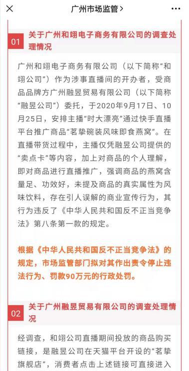 12月23日,监管部门公布处理结果,辛巴旗下公司被罚款90万元;随后快手方公布处理措施,封停辛巴个人账号60天,旗下27名主播被封15天。
