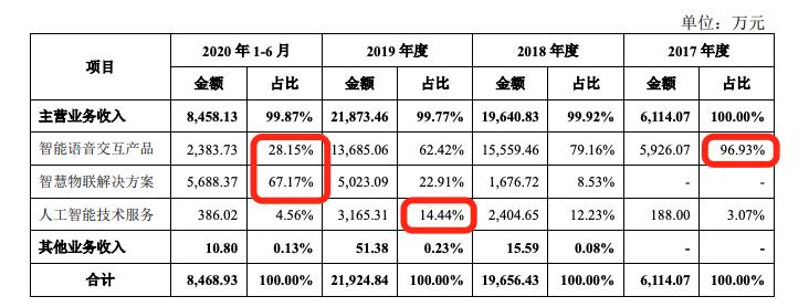 2017年,智能语音交互产品收入占比高达96.93%,但是到2020年上半年,份额已经逐年下降为28.15%。目前,收入比例最大的是智慧物联解决方案,占比为67.17%,而这项业务从2018年才开始有8.53%的收入。此外,人工智能技术服务从2017年的3%占比,到2019年升为14.44%,2020年上半年又下降为了4.56%。