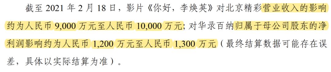 截至2月18日,影片票房约为31.68亿元时,华录百纳参股公司北京精彩时间获取的营业收入约为9000万到1亿元。除此以外,华录百纳还透露,公司从中获得的归属于母公司股东的净利润约为1200万到1300万元。