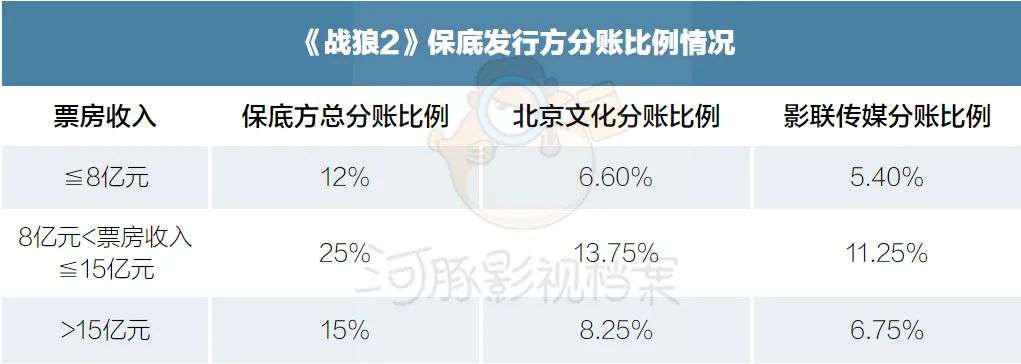 此前媒体报道过,2017年《战狼2》中,北京文化和影联传媒为其保底的票房收入为8亿元。上映前,两家保底公司支付保底费用约2.2亿元(其中北京文化1.4亿元,影联7759.42万元),占保底票房收入的27.5%。而后的分账,则按保底方与片方约定的比例进行。(注:后文中提及的所有分账比例都是减去专项基金、税费、院线与影院分账和宣发费用后的分账比例)