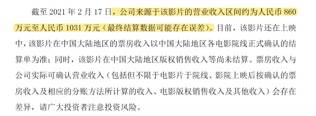 其中,截至2月17日,《你好,李焕英》票房达27.25亿元时。华谊兄弟从中获得的营业收入约为860万到1031万元,