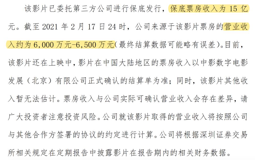 北京文化源于该片的营业收入约为6000万到6500万元。