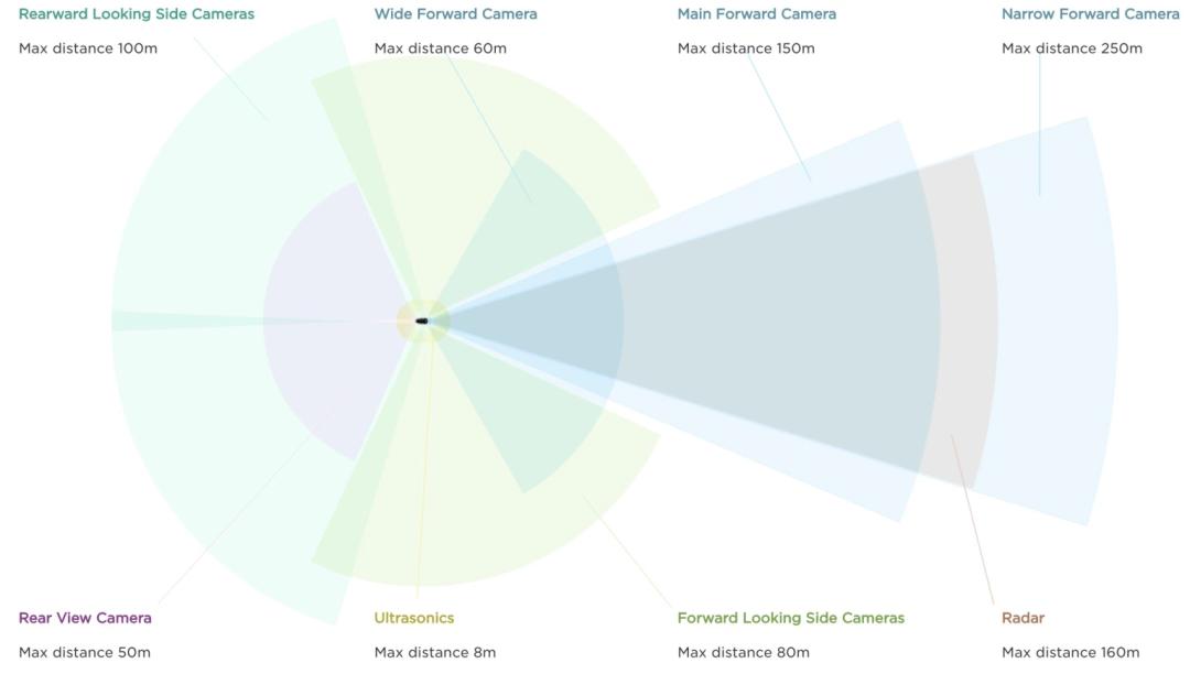 特斯拉在其车辆周围使用八个环绕摄像头,并辅以12个超声传感器和一个前置雷达。