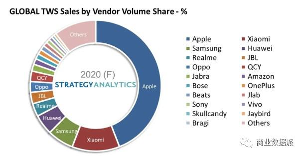 毫无疑问,真无线耳机给了手机厂商正面迎战传统耳机厂商一次绝佳机会。根据Strategy Analytics最近的报告中,2020年真无线耳机前几名的玩家都是手机厂商,苹果AirPods蓝牙耳机系列占据了超过40%的市场份额,紧随其后的则是小米,第三、四、五名分别是三星、华为、Realme 。