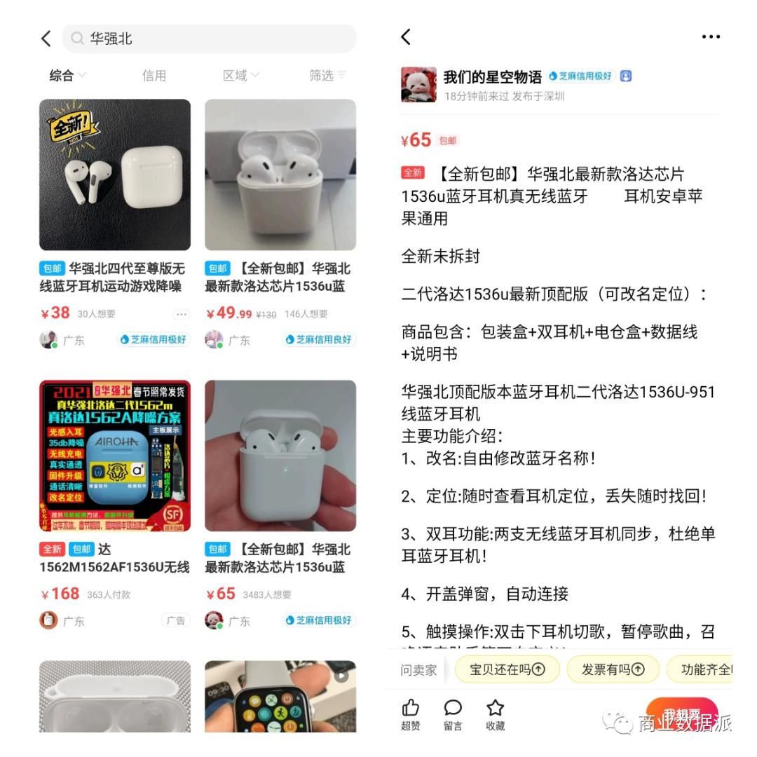 在二手平台搜索华强北,很容易就会发现不少外观和苹果AirPods极其相似的耳机,它们仿照苹果做到了相似的包装、相同的外观、支持蓝牙改名、GPS定位、入耳检测摘下暂停,甚至和iPhone配对也会有弹窗动画,但价格最低甚至都不到五十元。