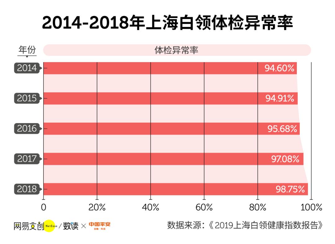 这临时抱的佛脚,显然是不太管用的。上海外服发布的《2019 上海白领健康指数报告》显示,过去五年间白领体检异常检出率在高位上再度攀升,达到 98.75% 。