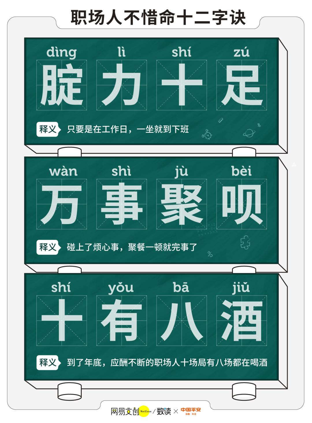 对比起老一辈的健康生活作息,职场人不仅没有行动起来,生活方式依旧是不健康的老样子。他们不惜命的表现用 12 个字来概括就是“腚力十足,万事聚呗,十有八酒”。