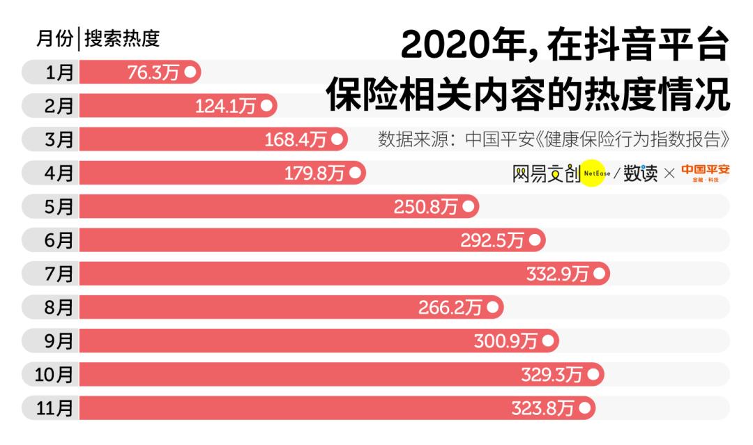 根据中国平安与巨量引擎发布的《用户健康保险行为报告》显示,2020 年,在抖音平台“保险”相关话题整体播放量超 349 亿次,以 2020 年 11 月为例,与去年同期相比,搜索热度增长率达 338% 。