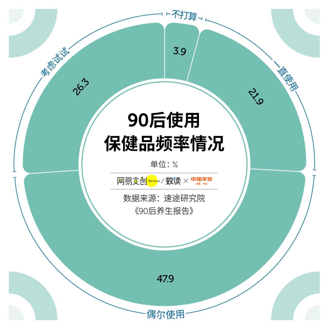 “吃最贵的保健品,敷最贵的面膜”,不管有没有用,先把各种维生素、阿胶等保健品备上再说。《90 后养生报告》显示,长时间使用保健品的 90 后占比为 21.9% ,偶尔使用和有意向使用保健品的超过 7 成,只有小部分人排斥保健品。