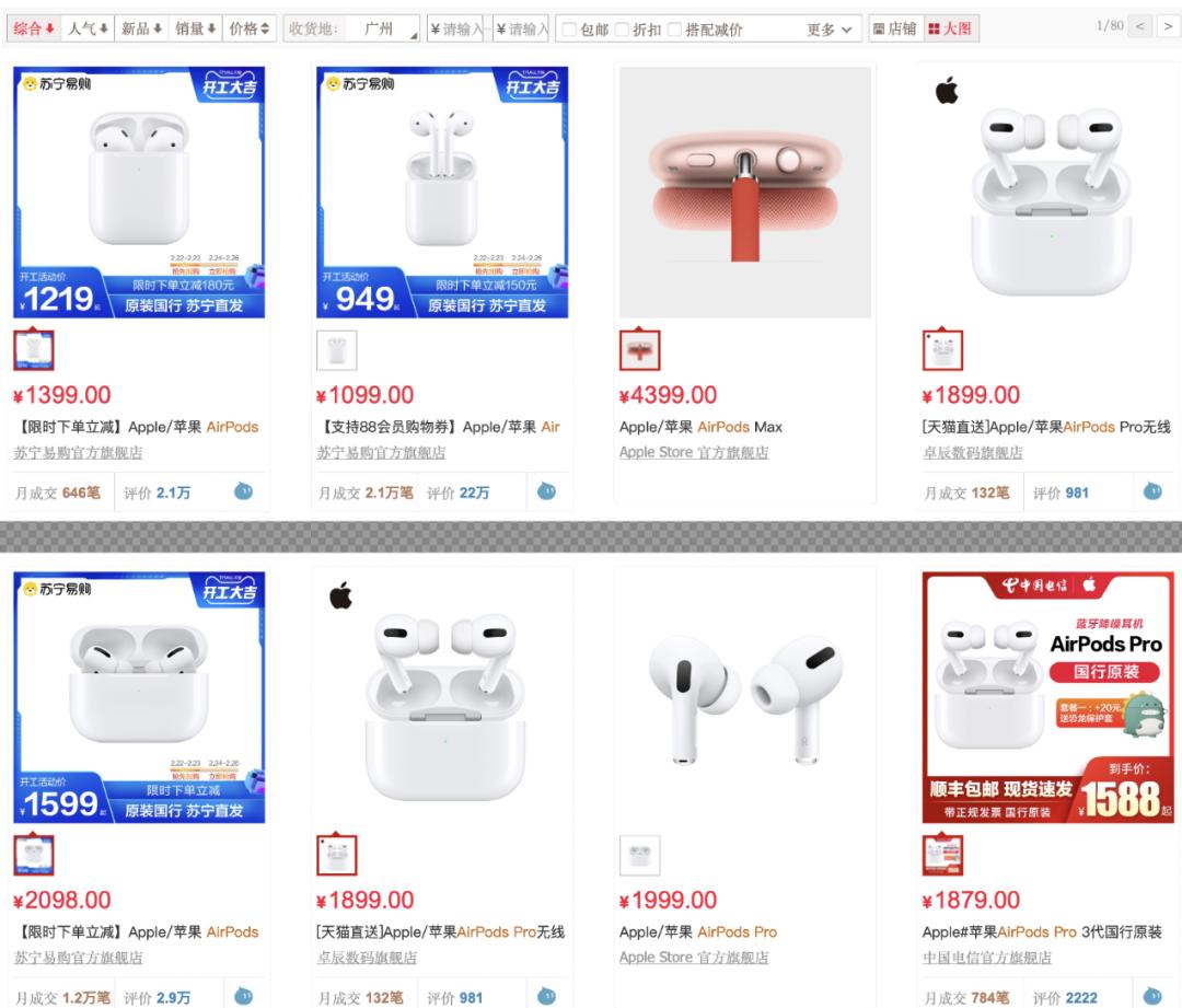 由于网上没有那么精准的统计数据,这里我们以天猫月销量为基准。天猫官网页面显示,AirPods月销量最高为2.1万笔,AirPods Pro月销量最高则是1.2万笔。由此可见,选择半入耳式耳机的消费者依然不在少数,同时说明这类耳机市场需求还是很高的。