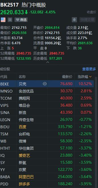 跌幅较大的有:迅雷跌超17%,迅雷跌近16%,小牛电动跌9.07%,蔚来跌7.92%,小鹏汽车跌7.05%,理想汽车跌6.7%。