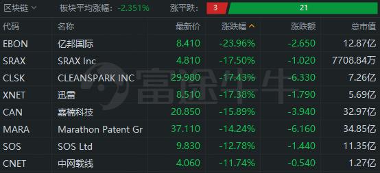 区块链股普遍大跌,迅雷跌超17%,嘉楠科技跌近16%。