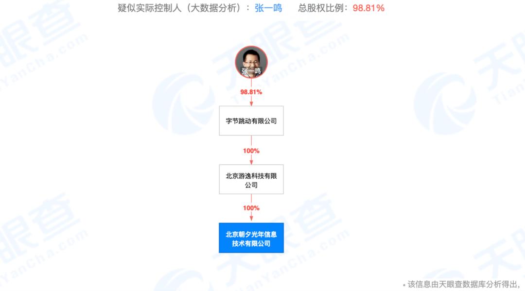 朝夕光年,向来是字节跳动游戏业务的重要操手。天眼查显示,北京朝夕光年信息技术有限公司成立于2013年,现任法定代表人是字节跳动副总裁、游戏业务负责人严授,股权穿透信息显示,该公司由字节跳动全资子公司北京游逸科技有限公司全资持股,疑似实际控制人为张一鸣。